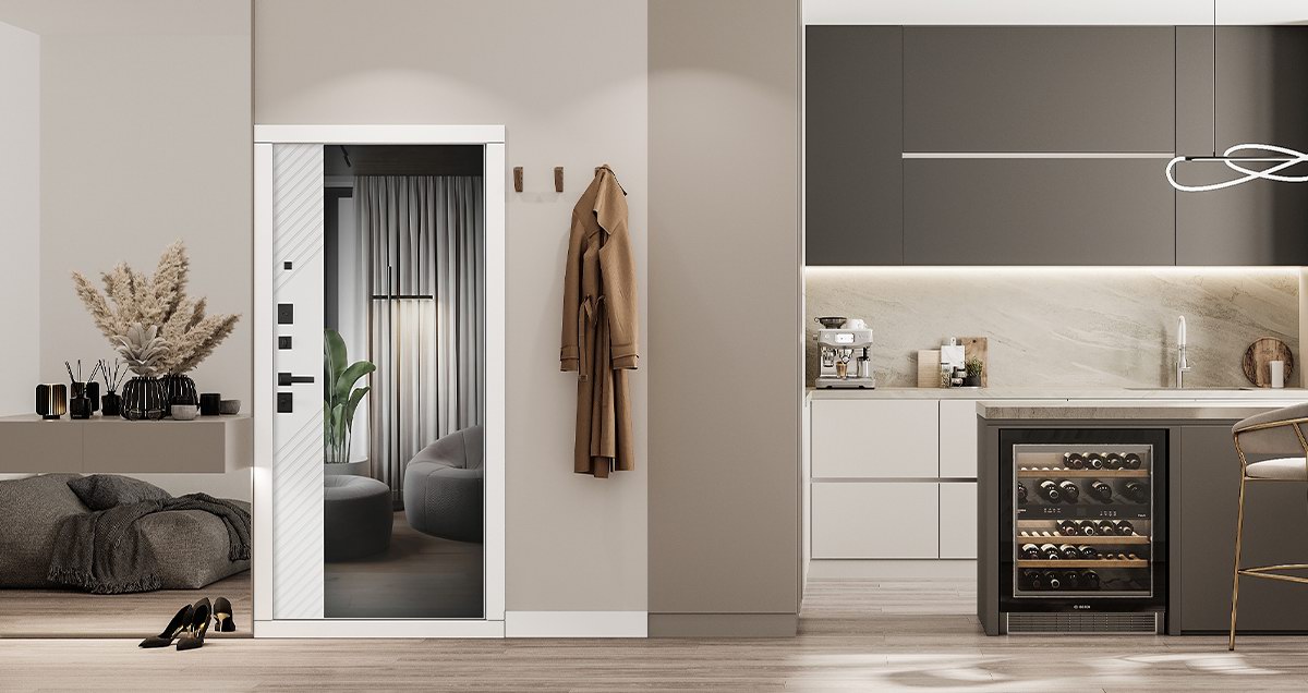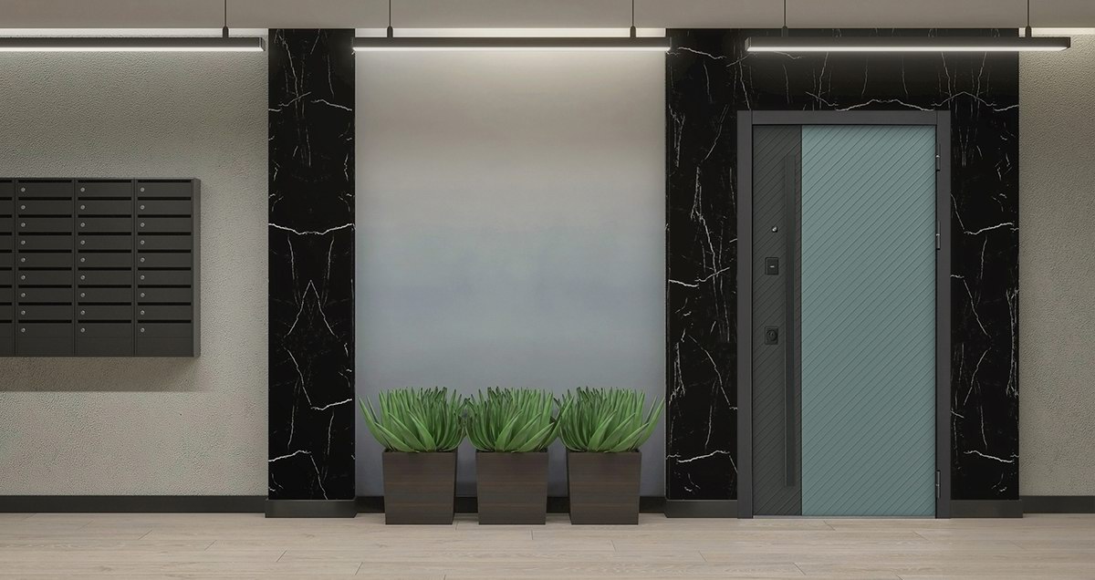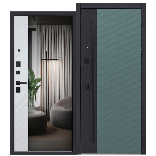 Лист металла 1,5 мм. Панель МДФ 16 мм (цветовая комбинация: "шагрень черная", "velluto avocado AG 711"). Линейная фрезеровка. Наличник МДФ 80 мм (цвет "шагрень черная") |