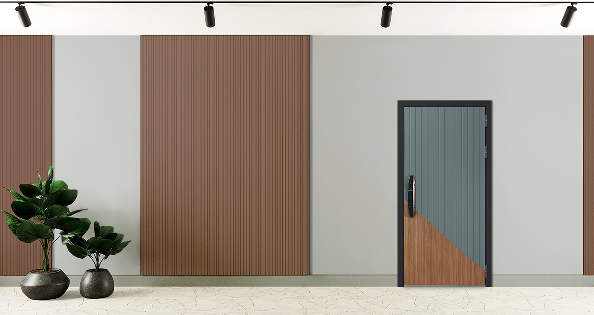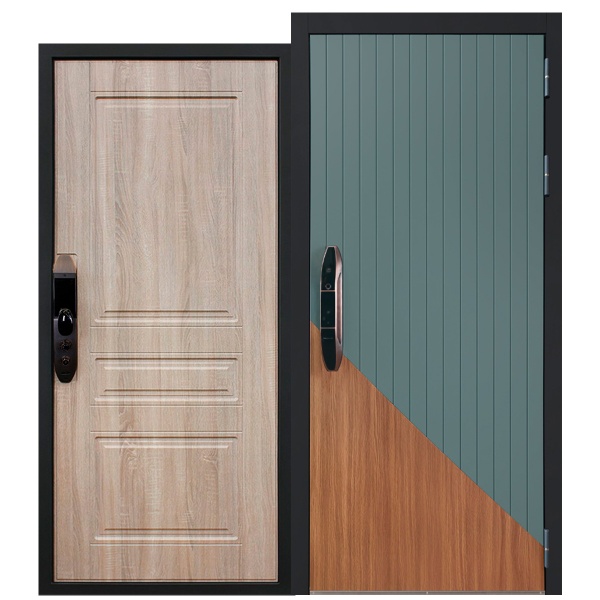 Лист металла 1,8 мм. Панель МДФ 12 мм (цветовая комбинация "дуб кантри", "авокадо"). Объемная фрезеровка. Наличник МДФ 100 мм (цвет "черный кварц"). |