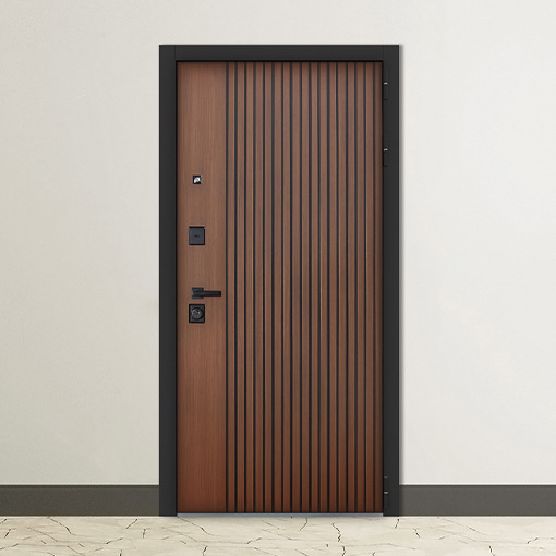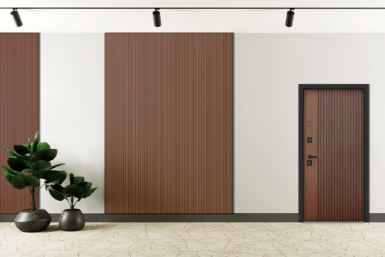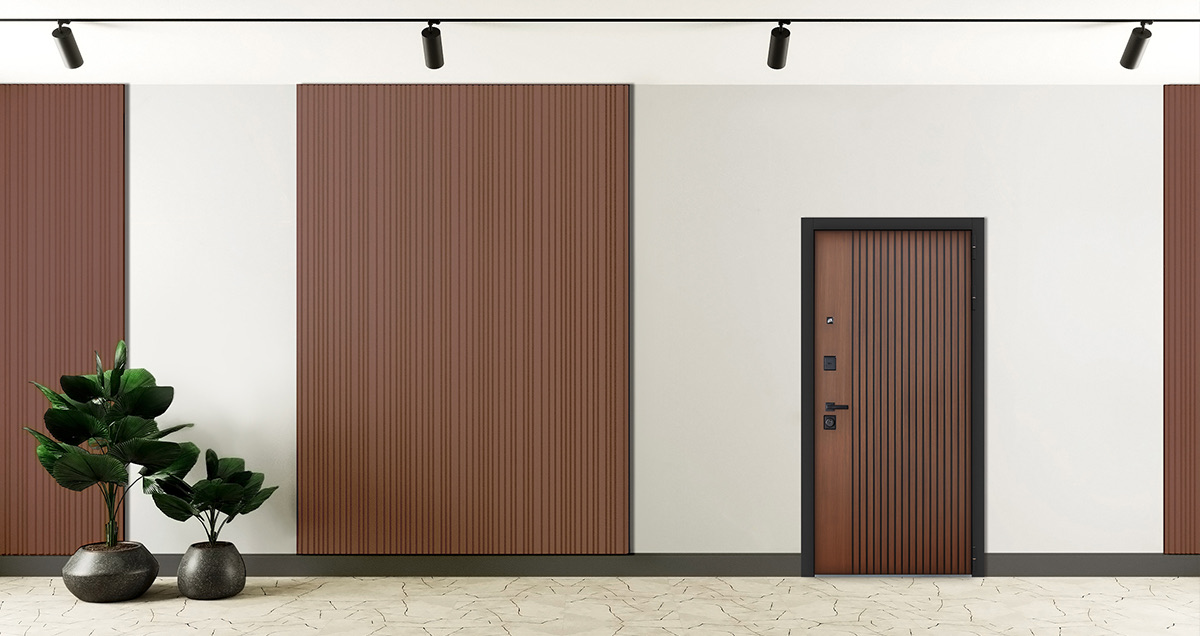 Наружный лист металла 1,5 мм. Экошпонированная дизайнерская панель МДФ 10 мм с линейной фрезеровкой, цвет "дуб кантри темный". Черное патинирование по фрезеровке. Наличник гладкий МДФ 80 мм., цвет "черный кварц".
