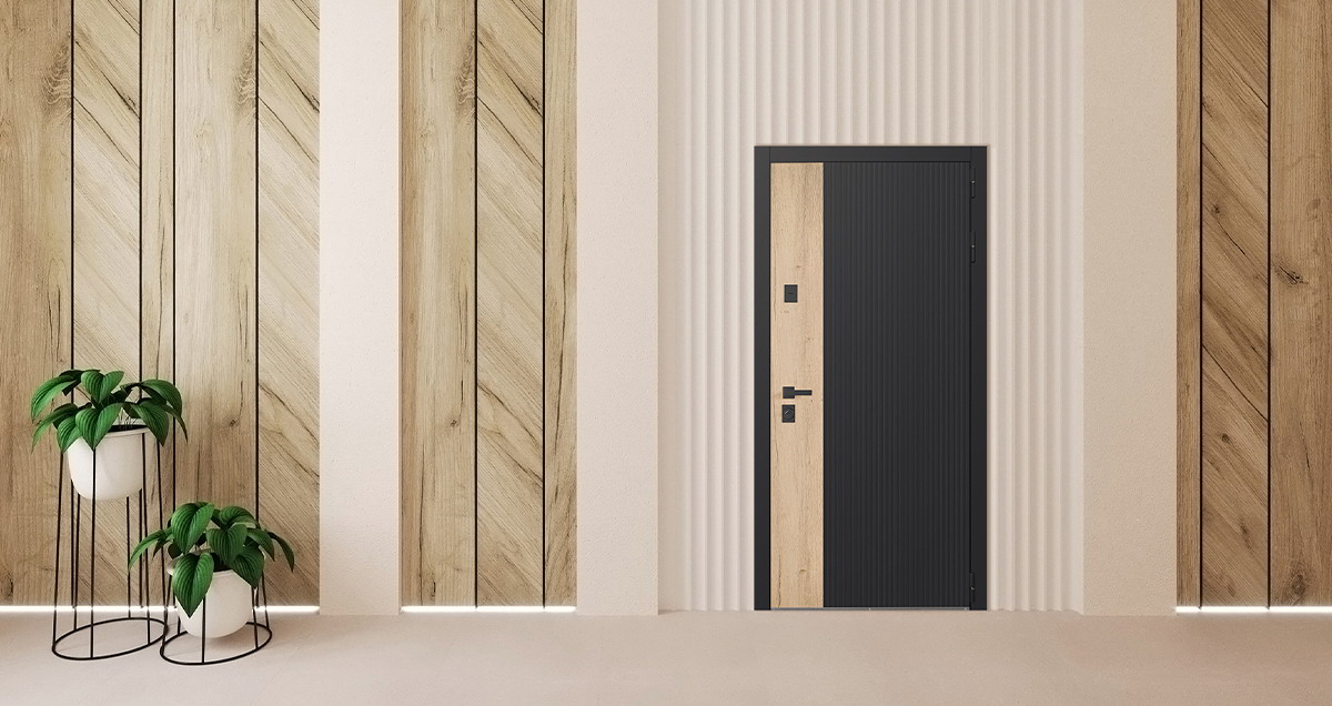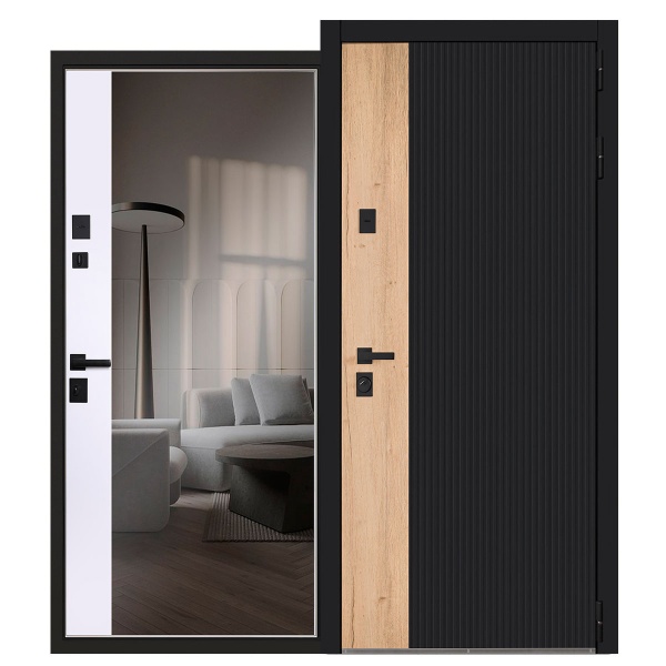 Лист металла 1,5 мм. Экошпонированная дизайнерская панель МДФ 10 мм. Линейная фрезеровка. Цветовая комбинация: «шагрень черная» , замковая часть "дуб галиф натур". Наличник МДФ гладкий 80 мм., цвет "черный кварц".