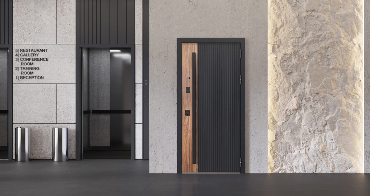 Лист металла 1,5 мм. Панель МДФ 16 мм (цветовая комбинация: "черная шагрень", "орех каньон коньяк"). Объемная фрезеровка. Наличник МДФ 80 мм (цвет "черный шагрень"). |