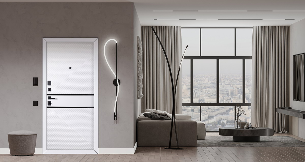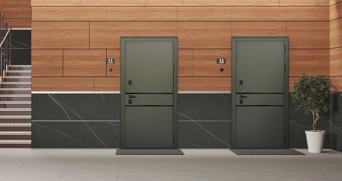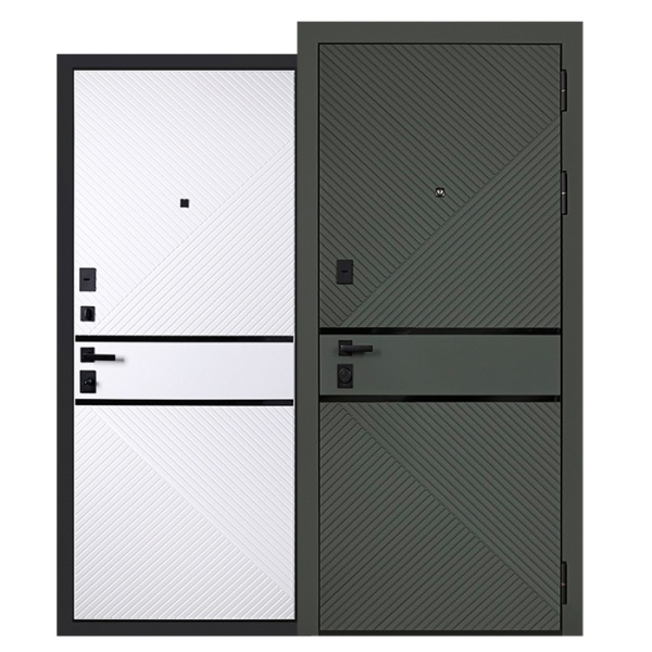 Лист металла 1,5 мм. Панель МДФ 10 мм (цвет "силк олива"). Объемная дизайнерская фрезеровка. Декоративные горизонтальные молдинги 10 мм (2 шт. цвет «черный»). Наличник МДФ (толщина 10 мм, ширина 80 мм). |