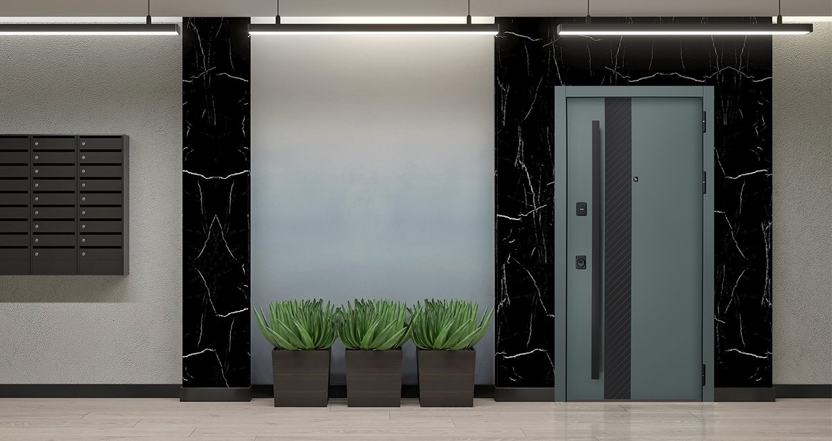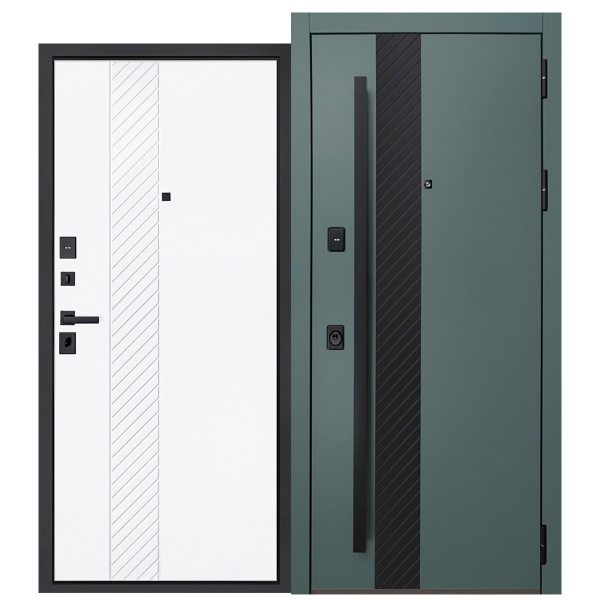 Лист металла 1,8 мм. Экошпонированная дизайнерская панель МДФ 16 мм (цвет:"velluto avocado"). Линейная фрезеровка. Декоративная вставка (цвет "шагрень черная"). Наличник МДФ гладкий 80 мм (цвет "velluto avocado").