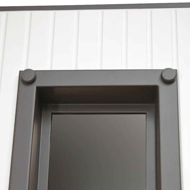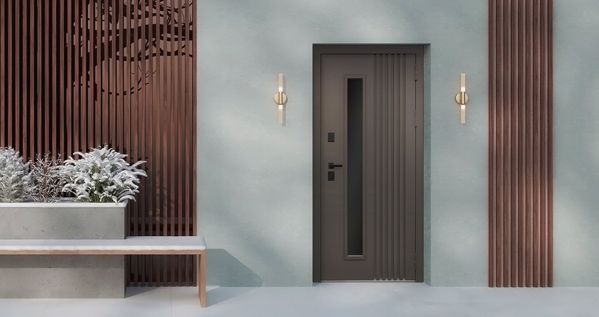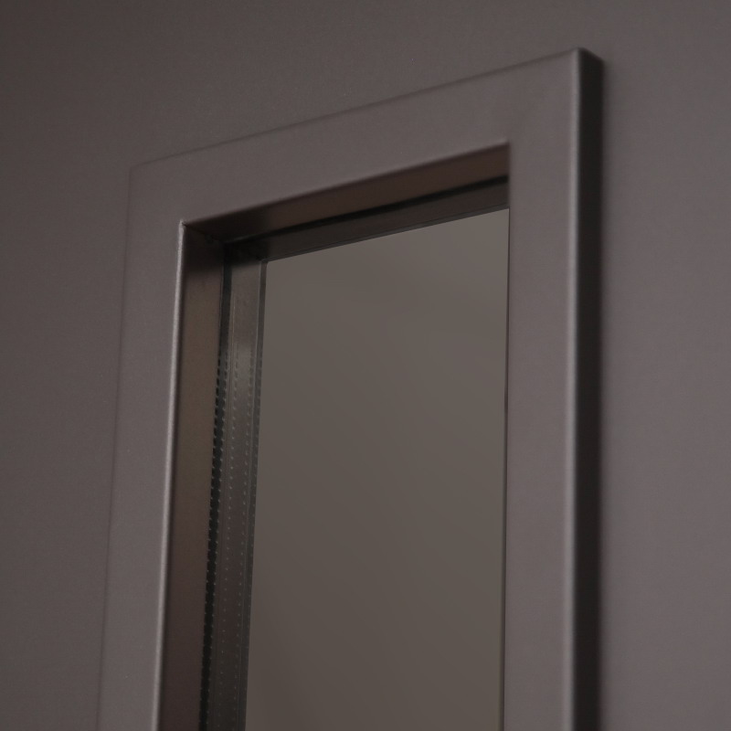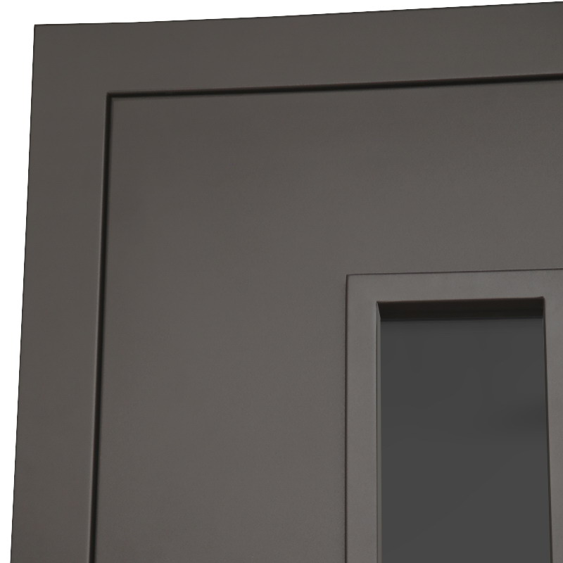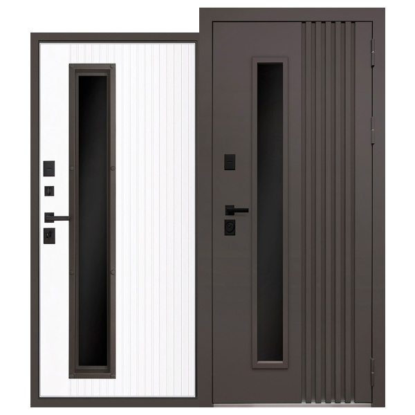 Лист металла 1,8 мм. Вертикальные рейки из металла. Два слоя покрытия. Тонированный двухкамерный стеклопакет. Наличник гладкий.