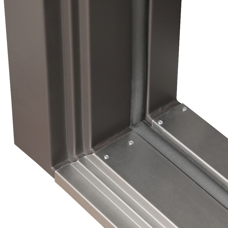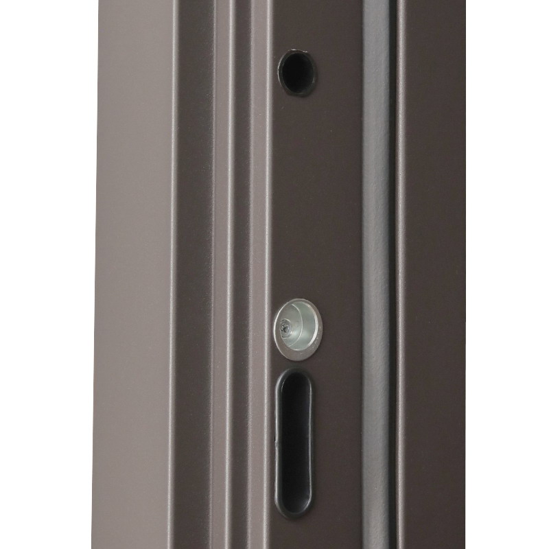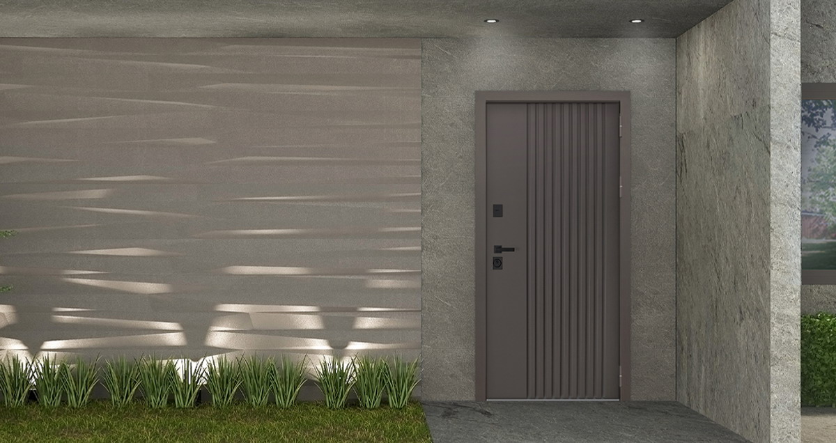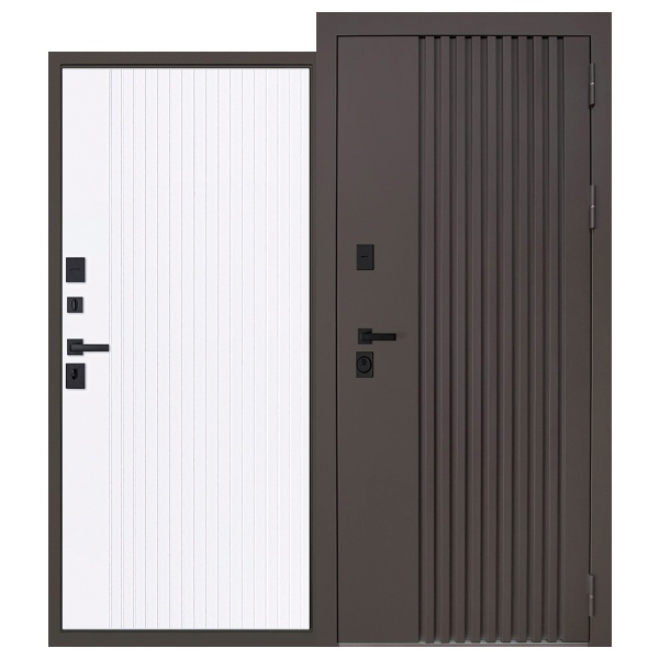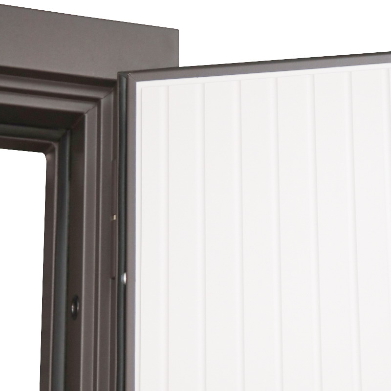 Лист металла 1,8 мм. Вертикальные рейки из металла. Два слоя покрытия. Тонированный двухкамерный стеклопакет. Наличник гладкий.