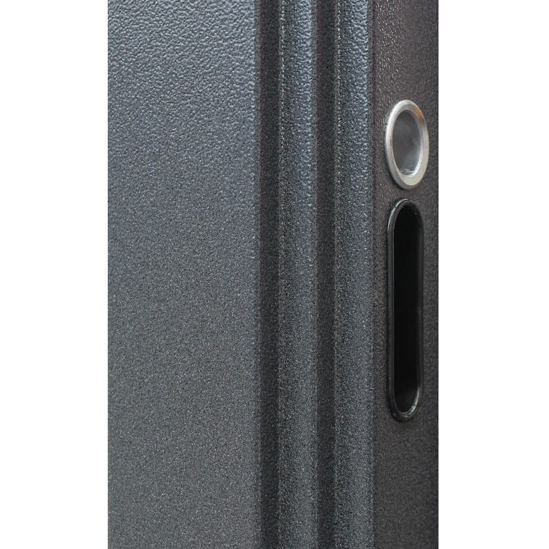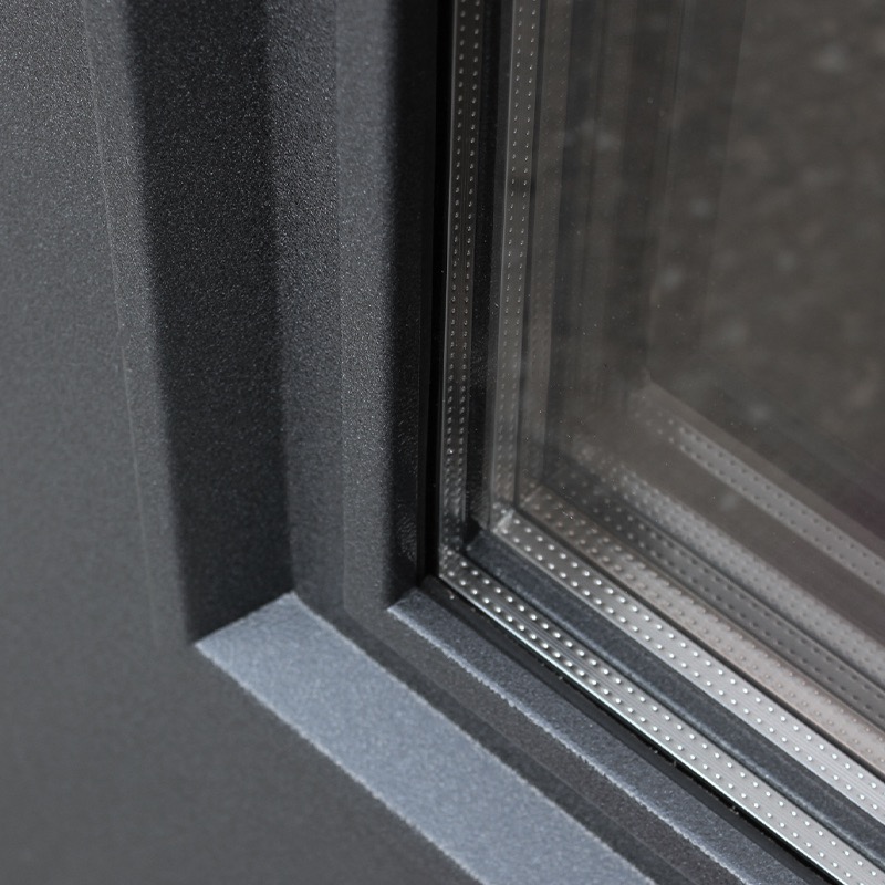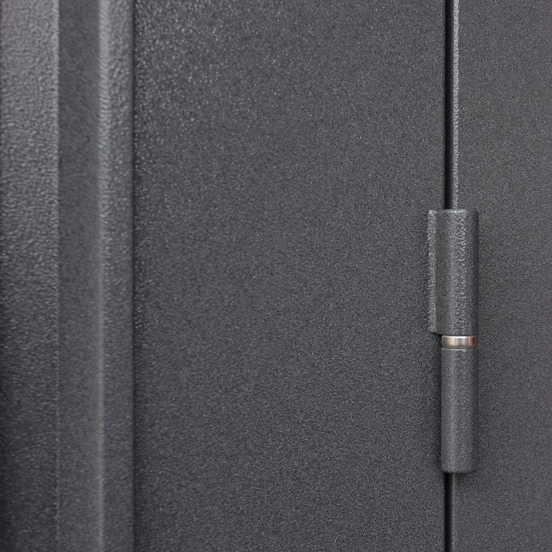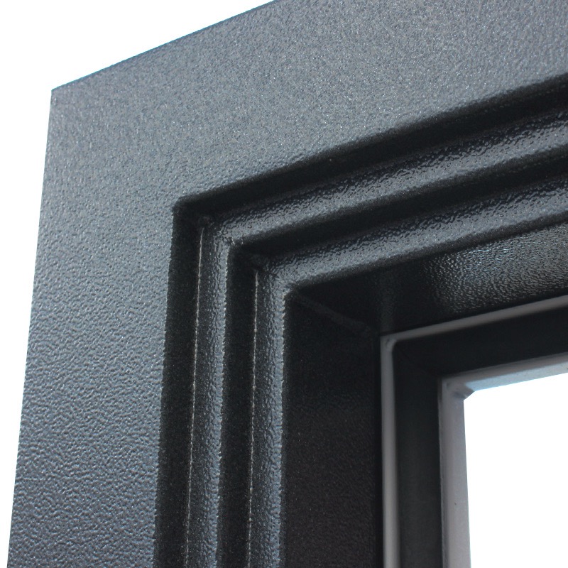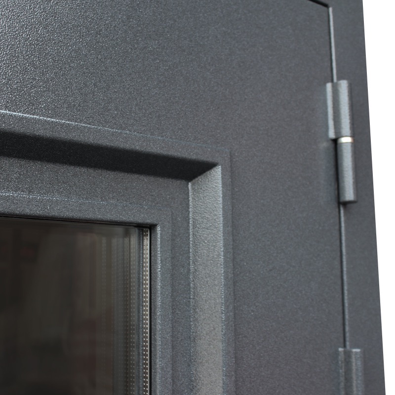 Лист металла 1,8 мм. Два слоя покрытия. Металлофиленки. Английская решетка внутри тонированного стеклопакета (цвет "Букле графит"). Наличники гладкие.