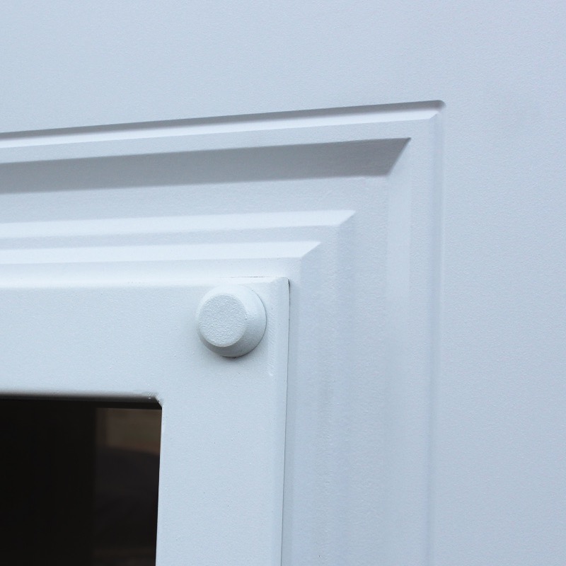 Панель МДФ 16 мм. цвет "Матовый белый ". Объемная фрезеровка вокруг стеклопакета. Прижимная рамка выполнена в виде широкого багета с применением технологии лазерной резки.