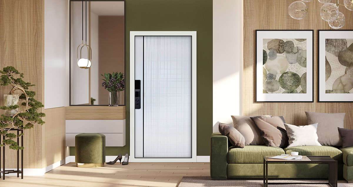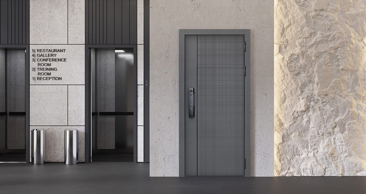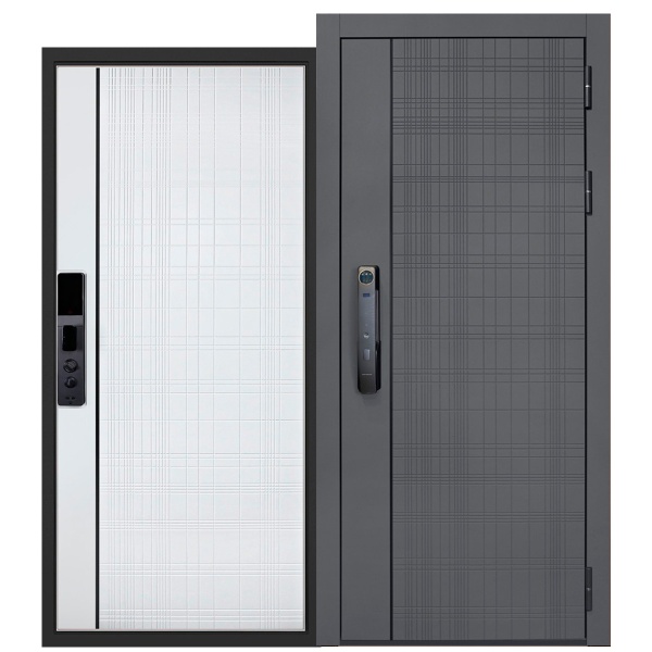 Лист металла 1,5 мм. Экошпонированная панель МДФ 10 мм (цвет "геометрия графит"). Вертикальный молдинг (цвет "черный"). Объемная фрезеровка. Наличник МДФ 80 мм гладкий. |