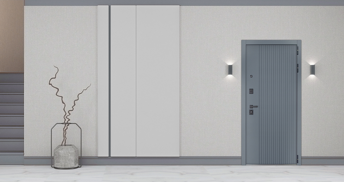 Лист металла 1,5 мм. Экошпонированная панель МДФ 10 мм. Линейная фрезеровка. Цвет "графит". Наличник МДФ гладкий 80 мм. Цвет "графит" |