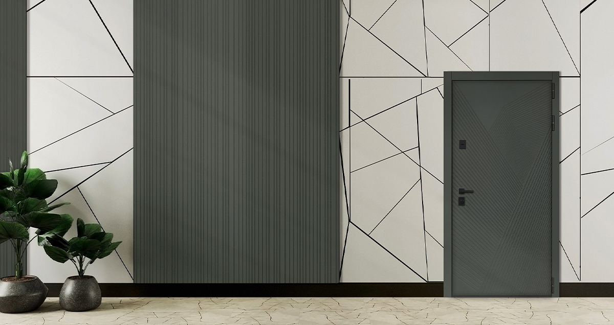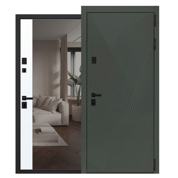 Лист металла 1,5 мм. Экошпонированная дизайнерская панель МДФ 10 мм (цветовая комбинация: "силк олива" и "дуб галиф натур"). Объемная фрезеровка. Наличник МДФ гладкий 80 мм. (цвет "черный кварц").