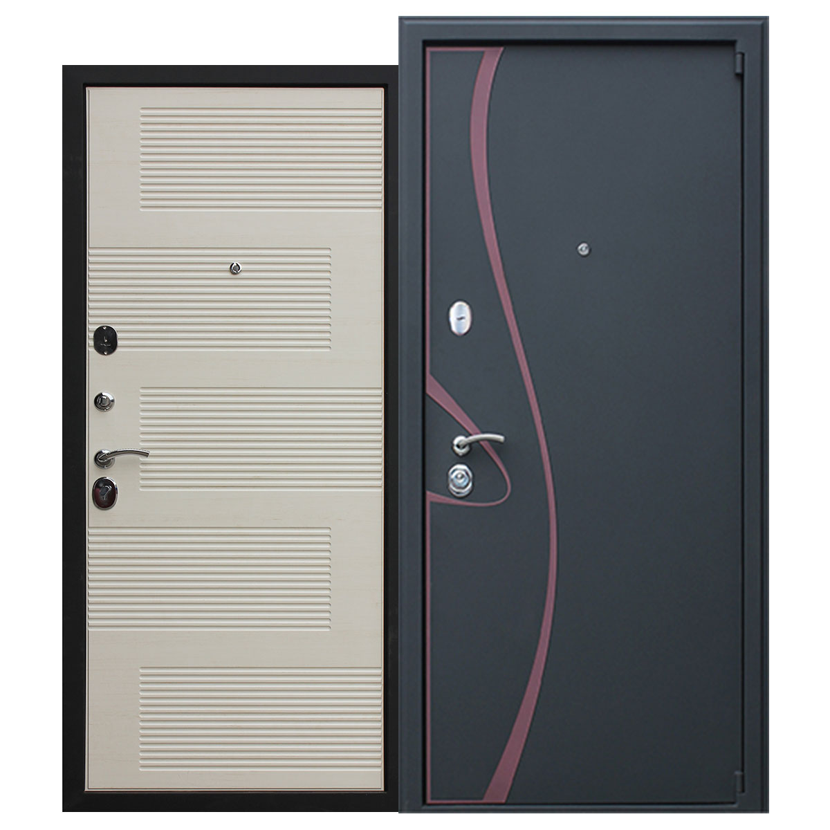 Лист металла — 1,8 мм (толщина металла в замковой части 5,4 мм). Декоративная вставка из металла. Порошковое покрытие "шелк черный", "шелк бордовый" (вставка). Наличник фигурный. |